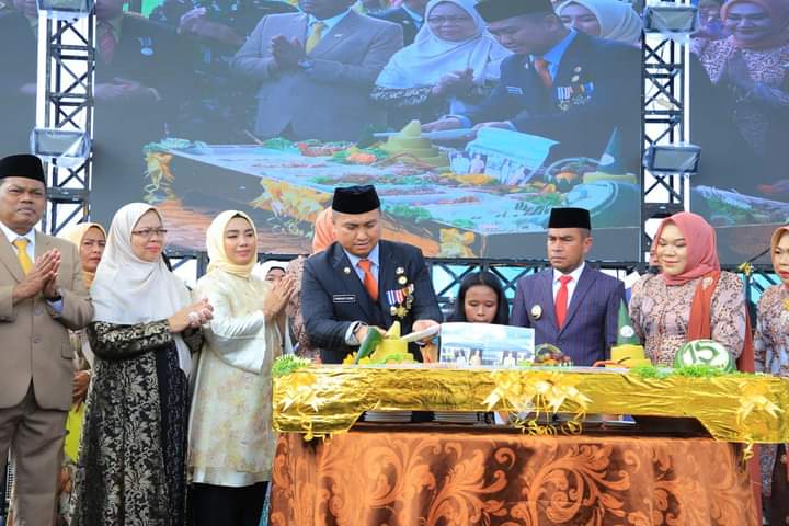 Pemberian nasi tumpeng dan bingkisan diserahkan Hendriyanto bersama Wakil Bupati, Samsul Tanjung, disaat acara resepsi dalam rangka Hari Jadi Kabupaten Labuhanbatu Utara ke 15, di alun-alun Aek Kanopan, Kecamatan Kualuh Hulu, Jumat (21/7/2023).
