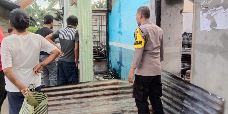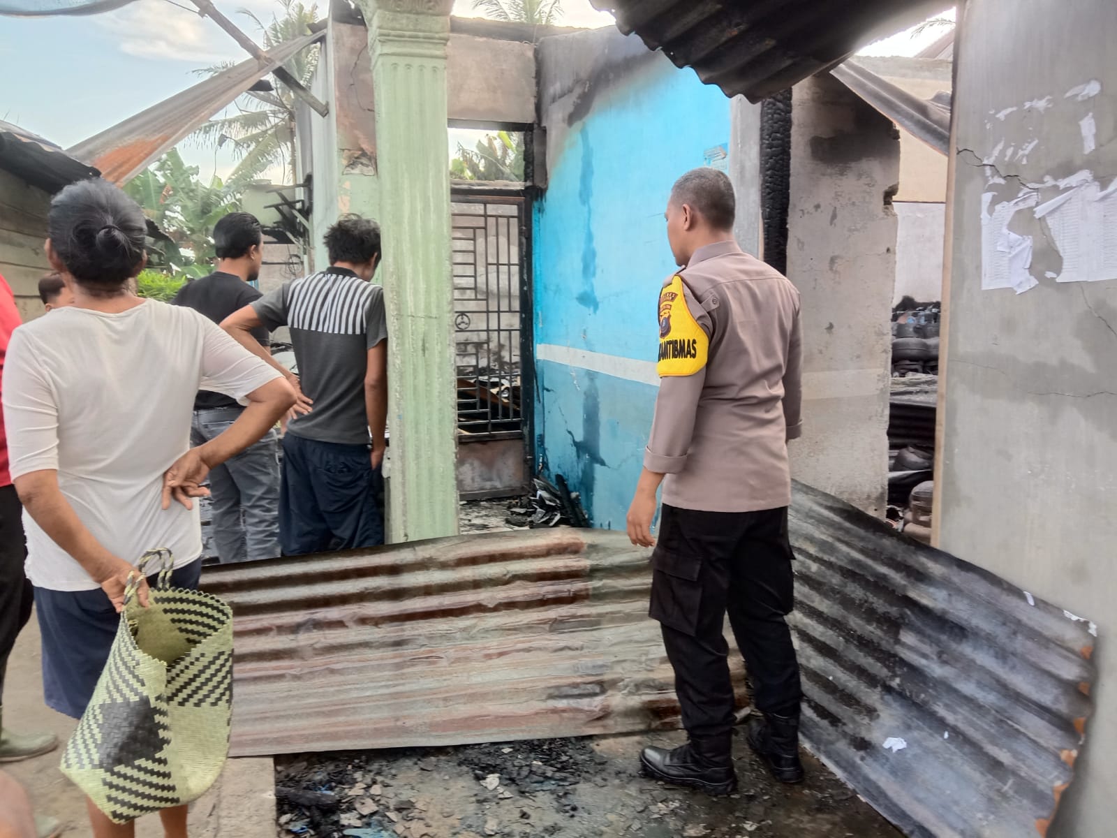 Selanjutnya mendengar teriakannya, warga datang. Tak lama korban kebakaran Pegang Hutagaul bersama anaknya keluar dari pintu belakang.
