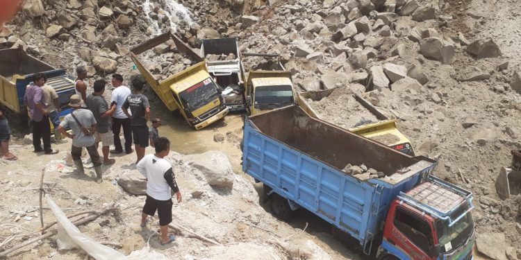 “Namun, nahas baru terkumpul sedikit batu diatas dua truk sekira pukul 11.30 wib longsor terjadi dan menimpa kedua korban. Sementara satu truk hancur akibat tertimpa batu runtuhan.”ungkap warga di lokasi kejadian.