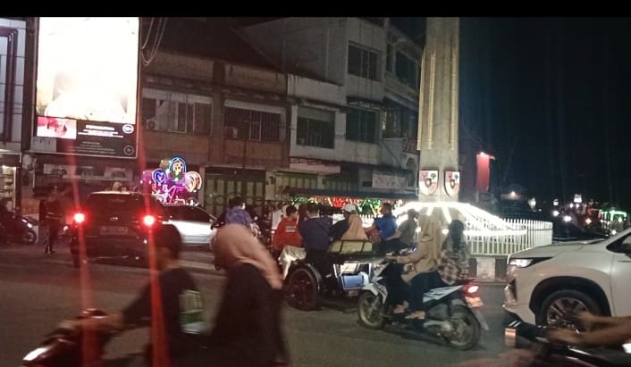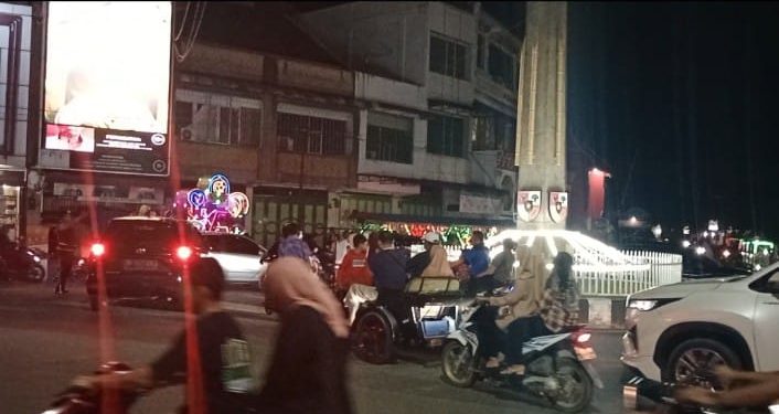 TASLABNEWS, ASAHAN-Arus lalu lintas di seputaran Tugu Pahlawan Kisaran, Kabupaten Asahan, Sabtu (9/12/2023) malam macet.