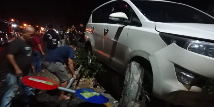 Dari pantuaan penumpang tidak mengalami luka hanya saja shok sehingga muntah berkali-kali, sementara mobil mengalami pecah ban depan kanan, bember depan dan belakang rusak akibat benturan. (Edi/Syaf)