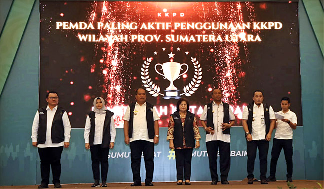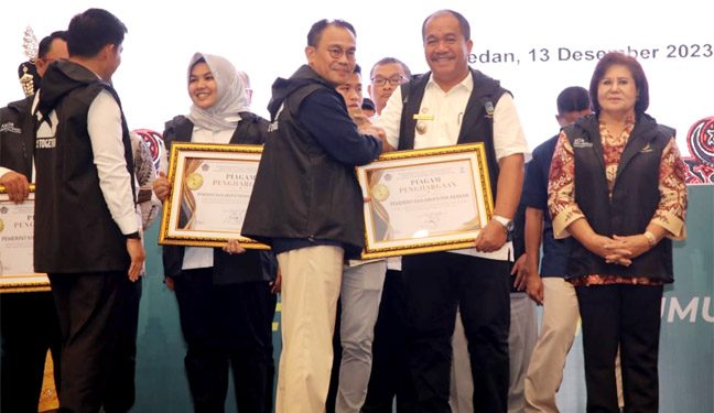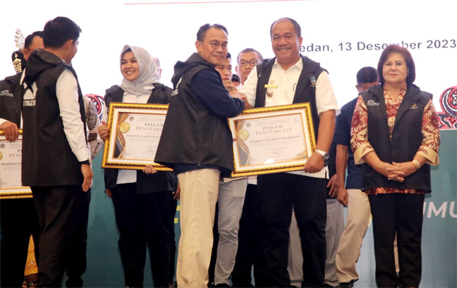 Penghargaan tersebut diserahkan dalam Rapat Koordinasi (Rakor) Pembangunan Sumatera Utara Tahun 2023 di Santika Hotel Medan, Rabu (13/12/2023), yang dirangkai dengan Penyerahan Daftar Isian Pelaksanaan Anggaran (DIPA) dan Buku Alokasi Transfer Ke Daerah (TKD) Tahun Anggaran 2024 Provinsi Sumatera Utara bagi seluruh Pemda se-Sumut.
