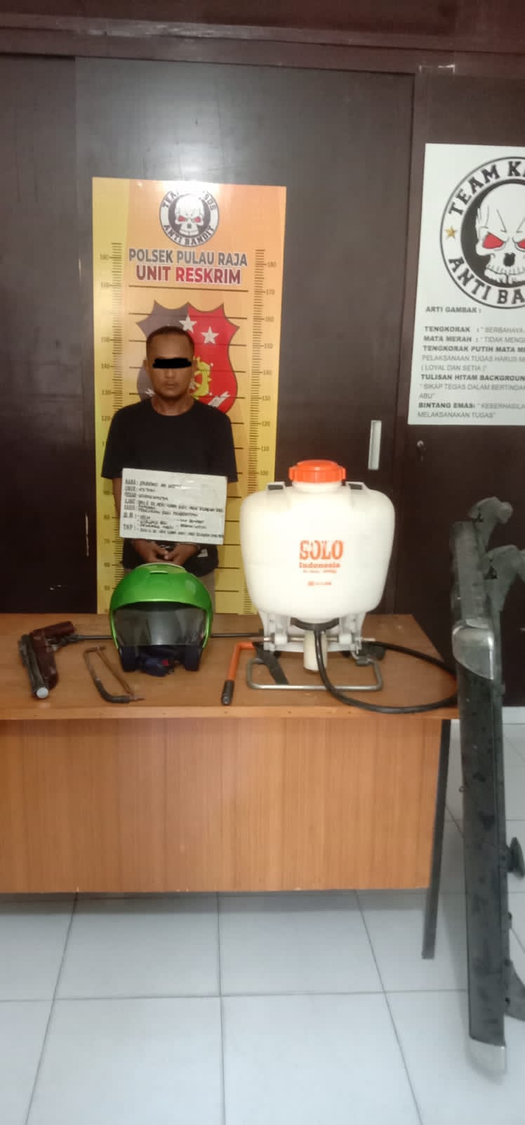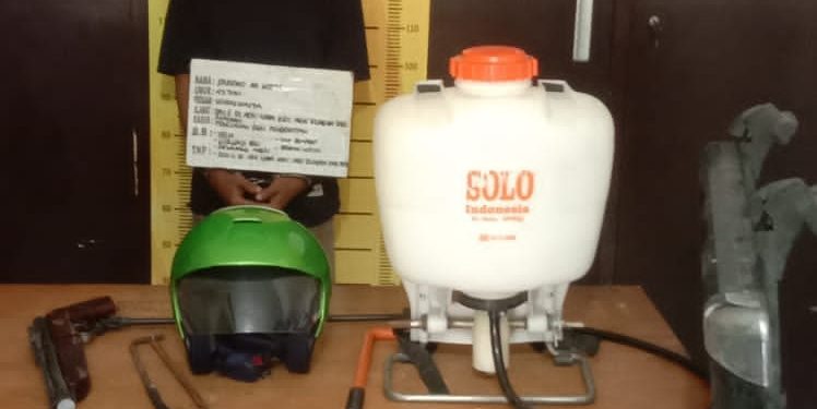 Ditempat itu pelaku langsung ditangkap dan dari tangan pelaku petugas berhasil mengamankan barang bukti 1 alat semprot merk solo, 1 Helm LTD warna hijau, 1 pucuk senapan angin merk Franklin, 1 gergaji besi.