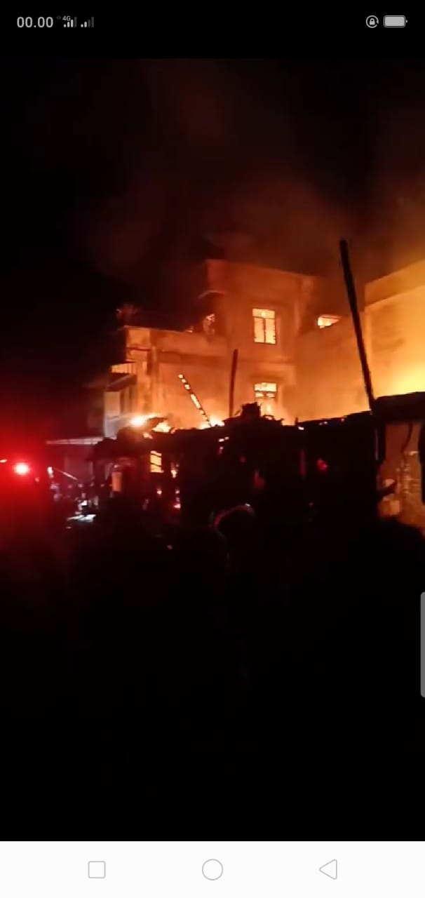 Api diketahui warga sudah membubung tinggi dan begitu cepat membakar kedua ruko semi permanen lantai dua yang masih berdinding papan. Api cepat membesar karena banyak barang yang mudah terbakar seperti sembako dan ledakan tabung gas serta kayu bangunan.