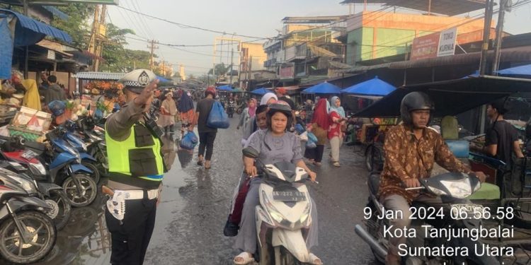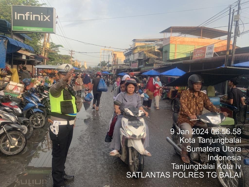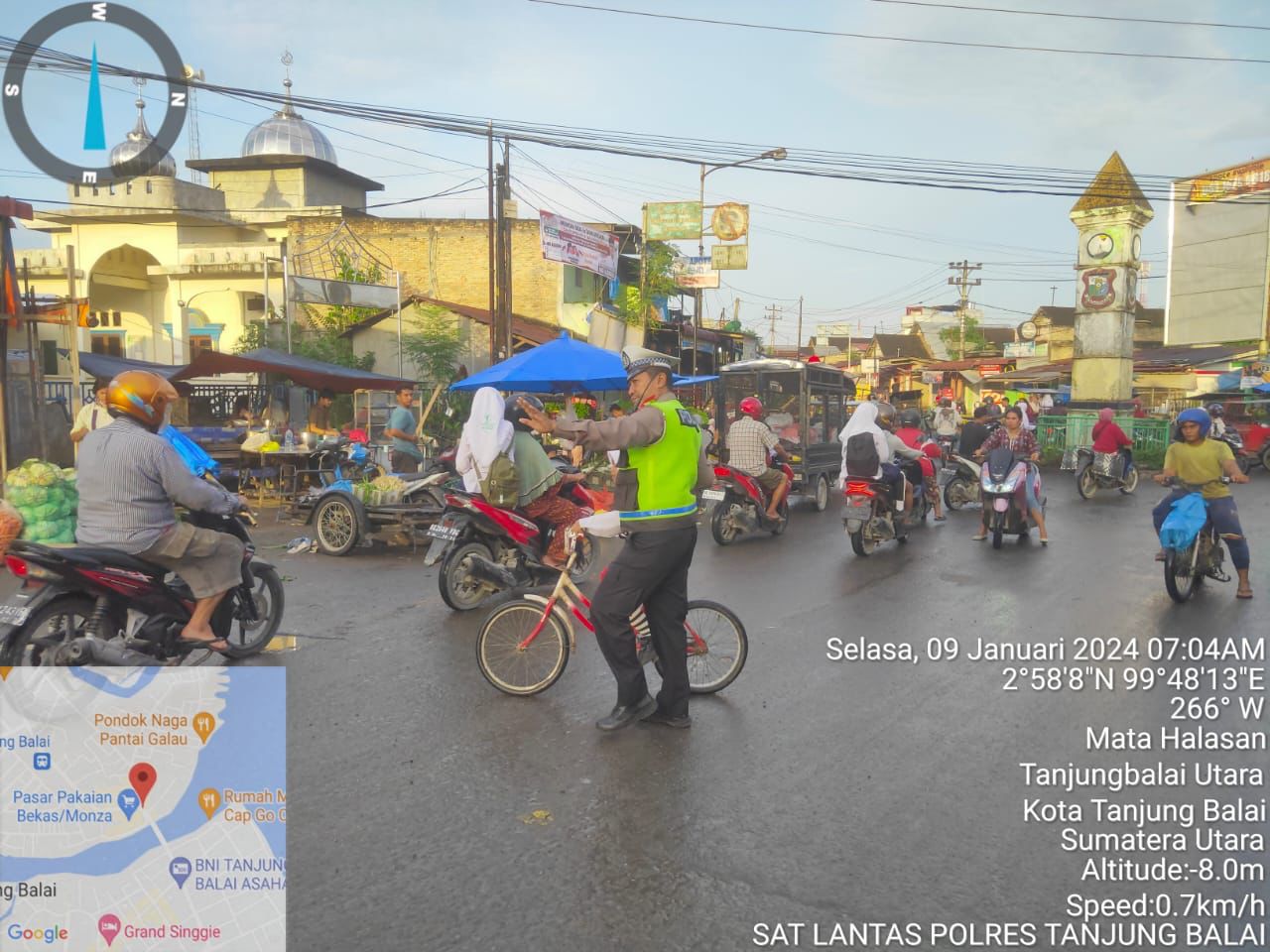 TASLABNEWS, TANJUNGBALAI -Personel Polres Tanjungbalai mengatur arus lalu lintas di persimpangan jalan, Selasa (9 Januari 2024) sejak pukul 06.30 WIB sampai pukul 07.45 WIB.