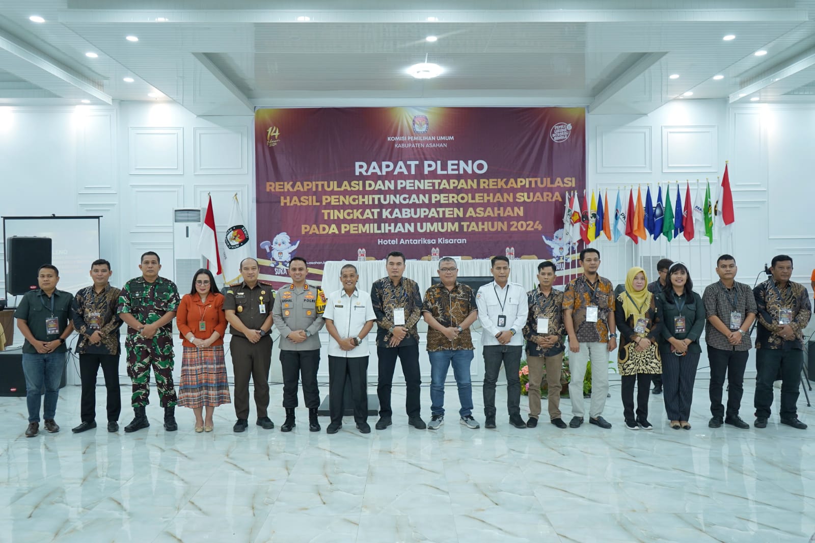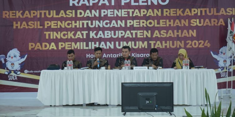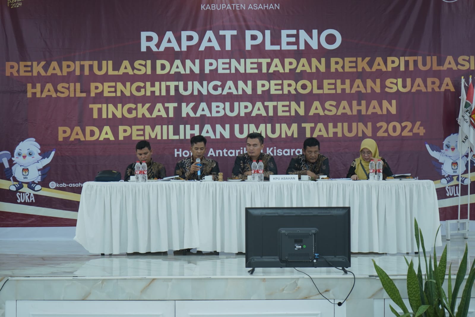 TASLABNEWS, ASAHAN – Komite Pemilihan Umum (KPU) Kabupaten Asahan menggelar rapat pleno terbuka rekapitulasi hasil perhitungan suara dan penetapan hasil pemilihan umum (Pemilu) di tingkat Kabupaten Asahan di Aula Hotel Antariksa Kisaran, Rabu (28/02/2024).