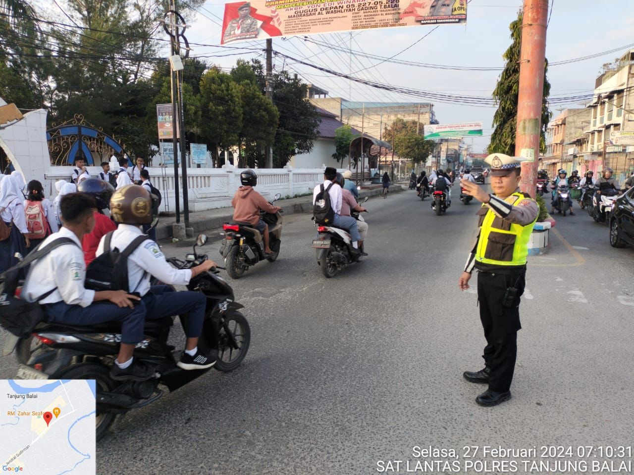 TASLABNEWS, TANJUNGBALAI – Personil Sat Lantas Polres Tanjungbalai, Selasa (27/2/24) sekira pukul 06.30 WIB hingga pukul 07.45 WIB, menjaga setiap persimpangan jalan protokol di Kota Tanjungbalai. Tujuannya agar tidak terjadi kemacetan.