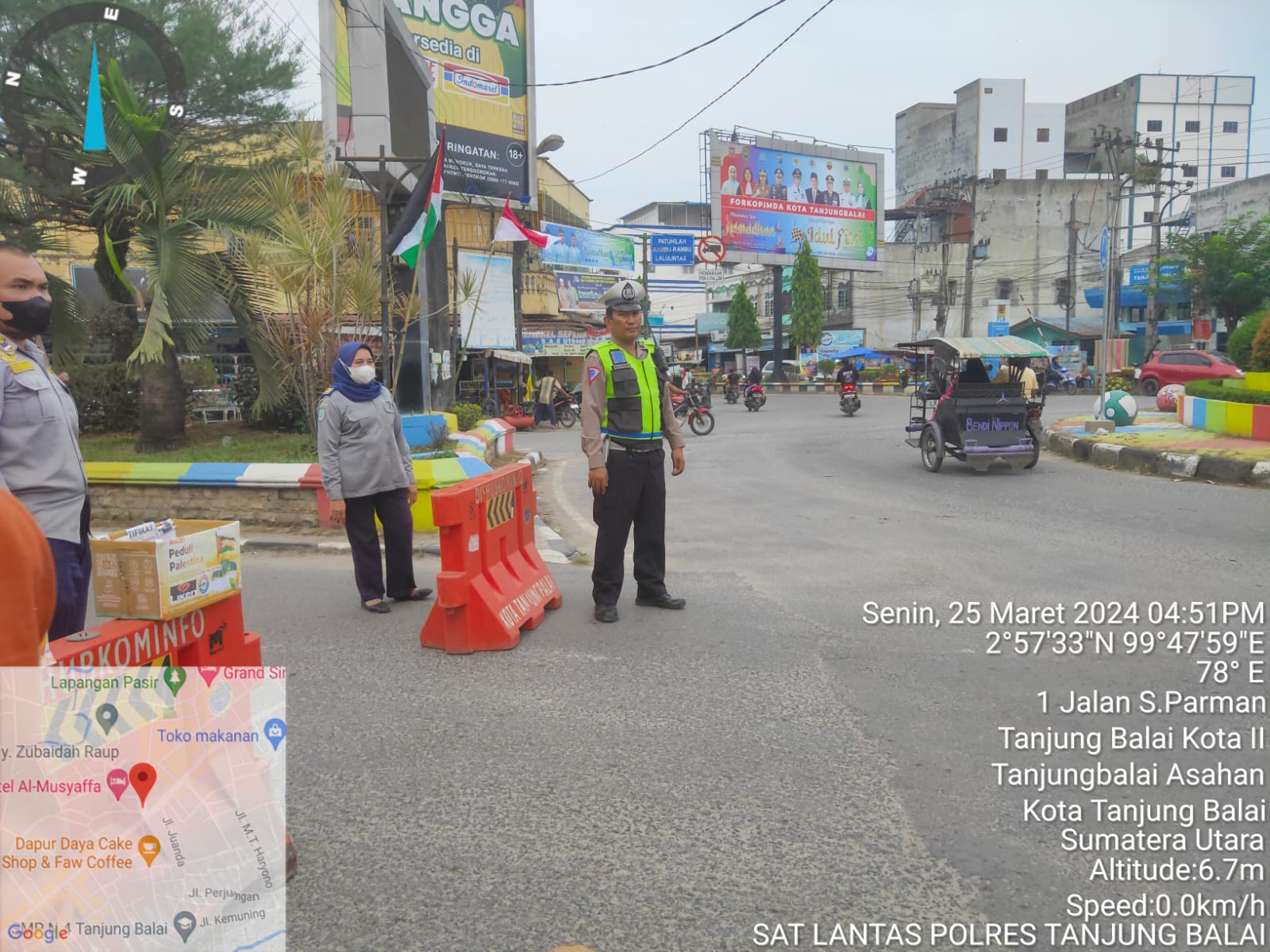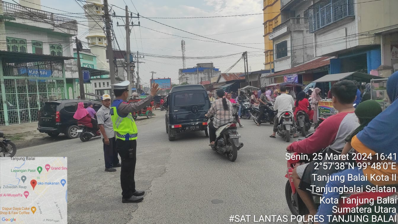 TASLABNEWS, TANJUNGBALAI – Cegah terjadinya kemacetan arus lalu lintas pada sore hari menjelang berbuka puasa khususnya di sepanjang Pasar Tumpah, personil Satuan Lalu lintas (Satlantas) Polres Tanjungbalai langsung turun melakukan pengamanan dan pengaturan arus lalu lintas, Senin (25/3/24), mulai dari pukul 16.30 WIB sampai pukul 18.30 WIB.