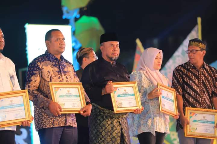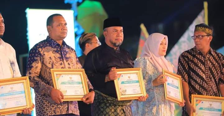 Di akhir kegiatan beberapa kepala daerah di Sumatera Utara dipanggil ke atas panggung untuk memperoleh penghargaan atas partisipasi sebagai peserta pada kegiatan Gelar Melayu Serumpun ke-7 Tahun 2024 di Kota Medan yang diberikan langsung oleh Walikota Medan Bobby Afif Nasution, disaksikan Menparekraf Sandiaga Uno, dan Pj Gubsu, Hassanudin. (Cad/syaf)