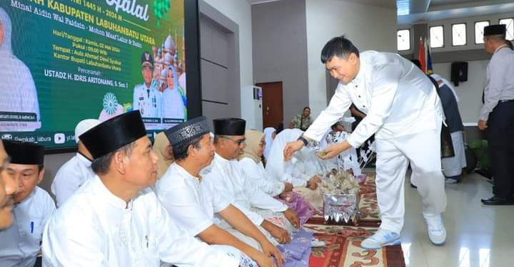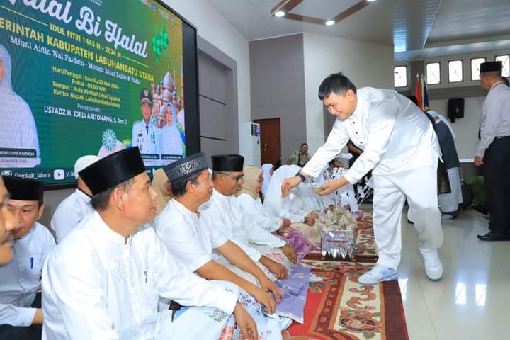 TASLABNEWS, LABURA-Dalam momentum suasana Idul Fitri 1445 Hijriyah, Pemerintah Kabupaten Labuhanbatu Utara (Labura) menggelar acara Halal Bi Halal Idul Fitri tingkat Kabupaten di Aula Ahmad Dewi Syukur, Kantor Bupati, Aek Kanopan, Kamis (2/5/2024).