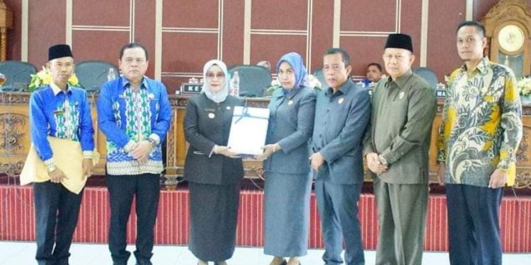 TASLABNEWS.COM, LABUHANBATU – Plt. Bupati Labuhanbatu Hj. Ellya Rosa Siregar, S.Pd., MM menyerahkan Laporan Keterangan Pertanggungjawaban TA 2023 pada Rapat Paripurna Pembahasan LKPJ Bupati Labuhanbatu, di Ruang Rapat Paripurna DPRD Labuhanbatu setempat, Kamis (02/05/2024).
