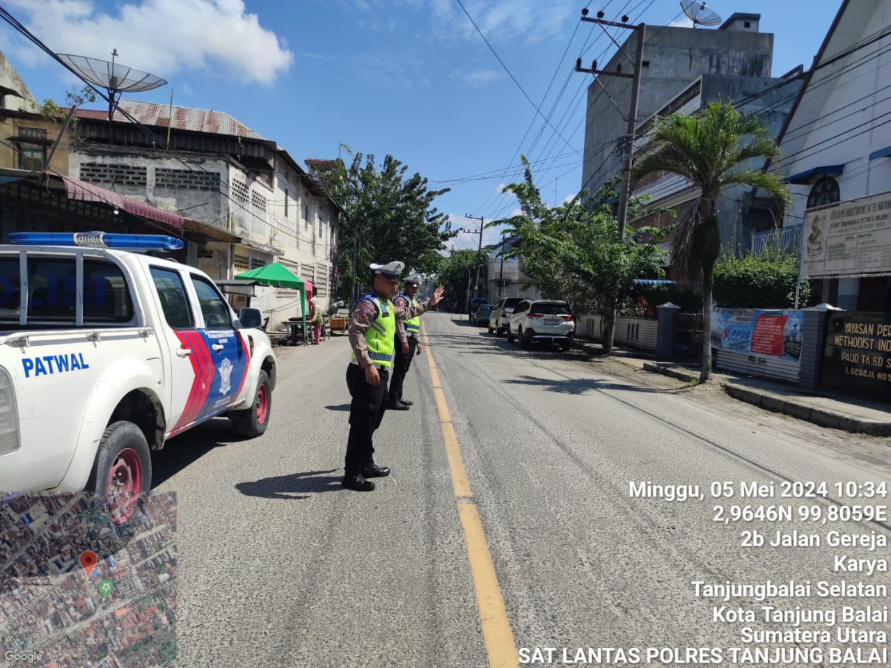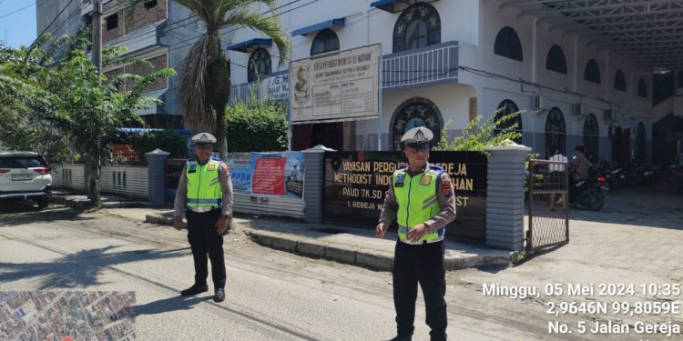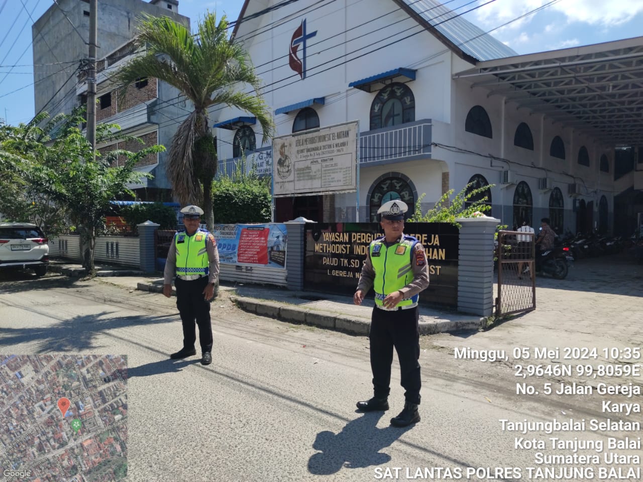 TASLABNEWS, TANJUNGBALAI – Personel Satlantas Polres Tanjungbalai melakukan pengamanan dan pengaturan arus lalu lintas, Minggu (05/5/24), di depan gereja pada saat ibadah minggu mulai dari pukul 09.00 WIB sebelum ibadah berlangsung hingga ibadah selesai.