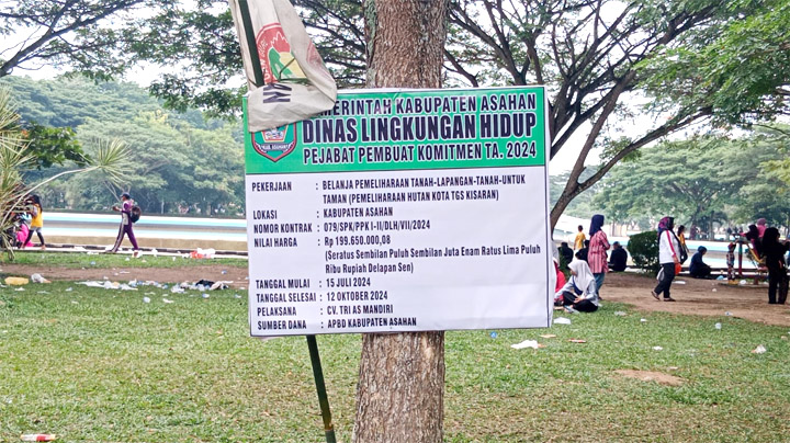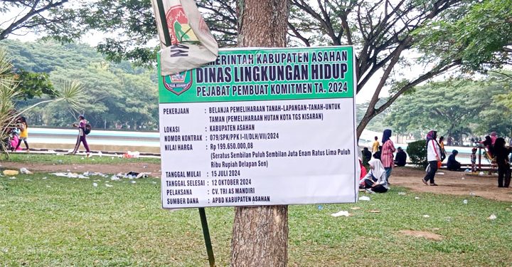 Seperti yang terlihat oleh kru media taslabnews.com, Minggu (11/8/2024), di Hutan Kota TGS Kisaran, Kecamatan Kisaran Barat, Kabupaten Asahan. CV Tri As Mandiri selaku pelaksana pekerjaan pemeliharaan Hutan Kota TGS Kisaran, memasang papan kegiatan proyek di pohon Hutan Kota TGS Kisaran.