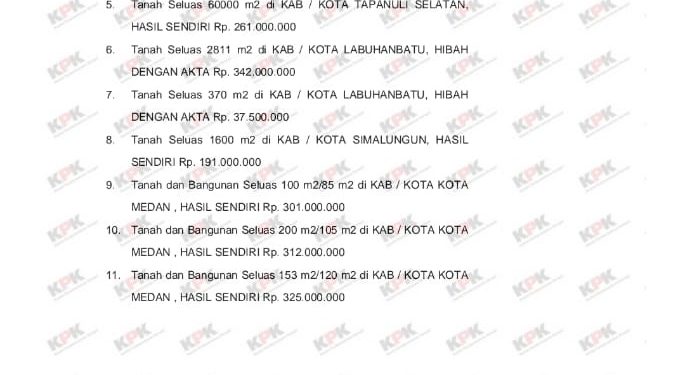 Harta kekayaannya meliputi 6 item tanah dan bangunan di Kota Medan, Kabupaten Labuhanbatu dan Kota Bandung yang nilainya mencapai Rp3 miliar lebih.