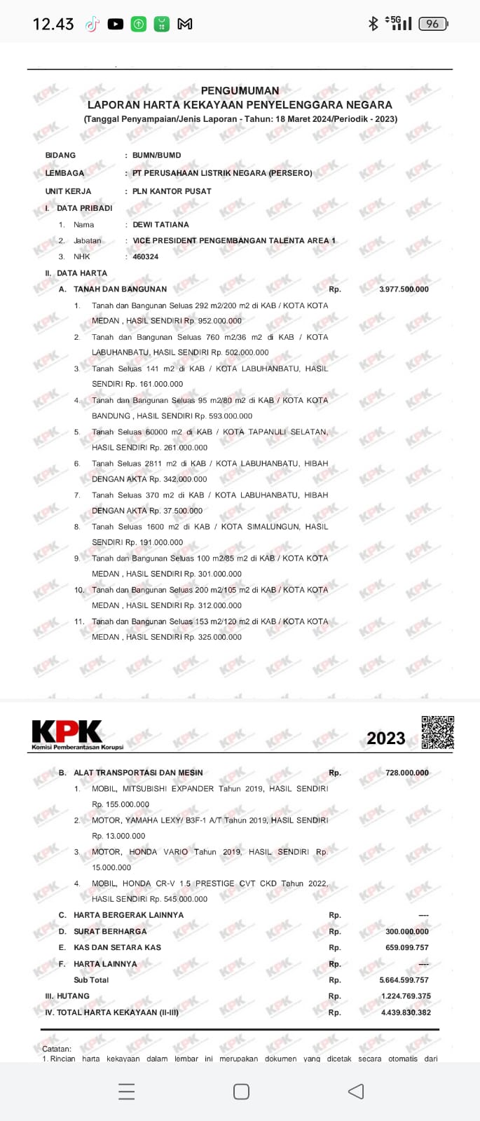 Sementara itu, berdasarkan data LHKPN tahun 2023 yang diterima awak media, Dewi Tatiana memiliki kekayaan cukup fantastis. Nilai kekayaannya sebesar Rp4.439.830.382.