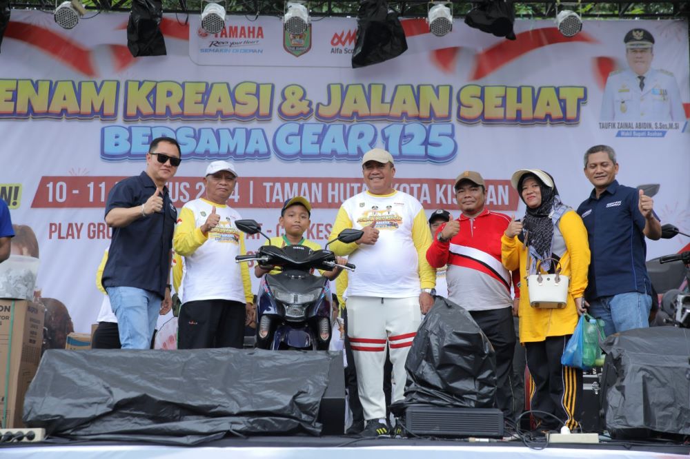 Terlihat Bupati Asahan bersama dengan Wakil Bupati Asahan, Forkopimda dan Pimpinan Yamaha menyerahkan satu unit sepeda motor kepada peserta gerak jalan, yang nomornya terpilih melalui lucky draw.