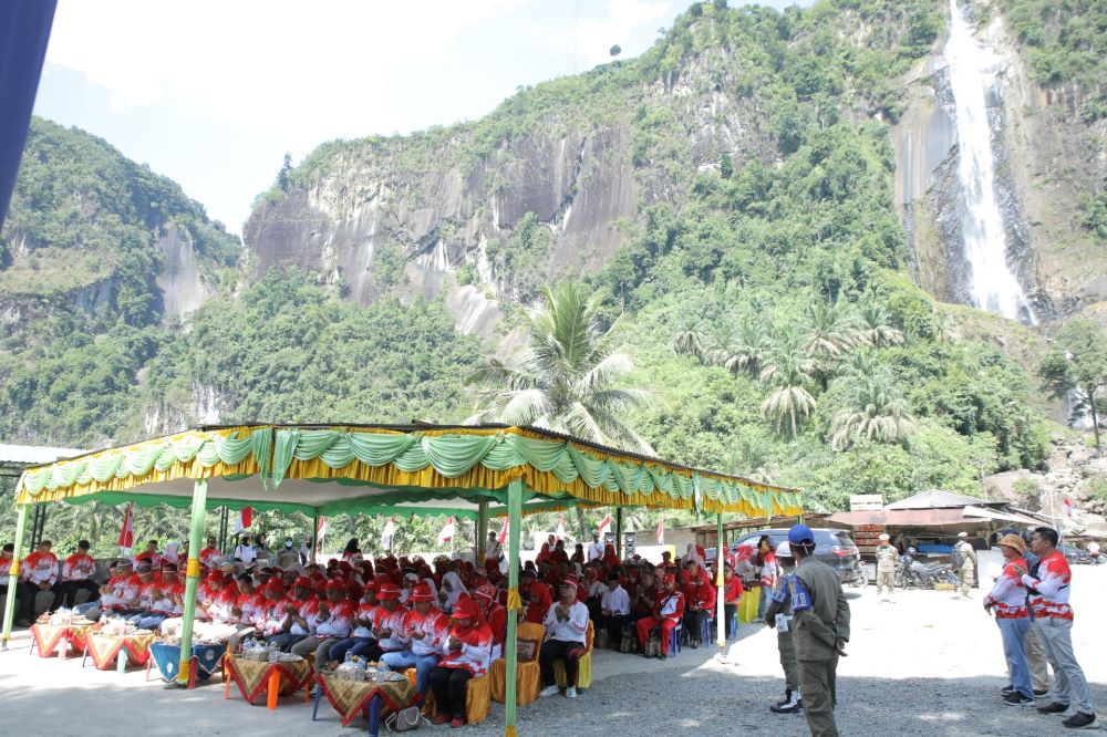 Sebelum pengibaran Bendera Merah Putih secara serentak, Bupati Asahan menandatangani prasasti jalan setapak di kawasan Wisata Air terjun Ponot.
