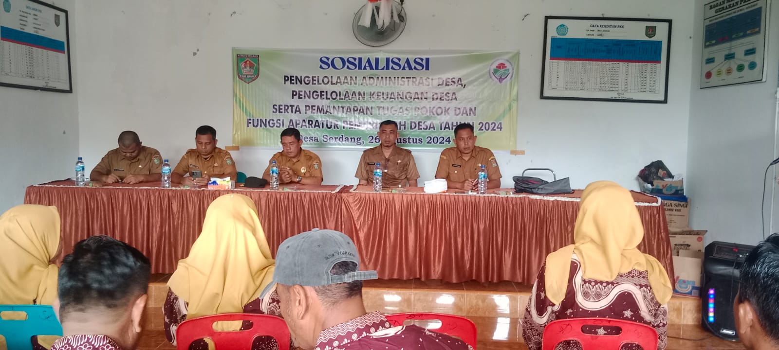 Kepala Desa Serdang Guntur gunawan mengucapkan selamat datang kepada narasumber dari kegiatan sosialisasi ini adalah dari Dinas PMD Kabupaten Asahan diantaranya Bapak Arianto SE, Bapak Eri Kurniawan, Bapak Ghazally di kantor desa Serdang.