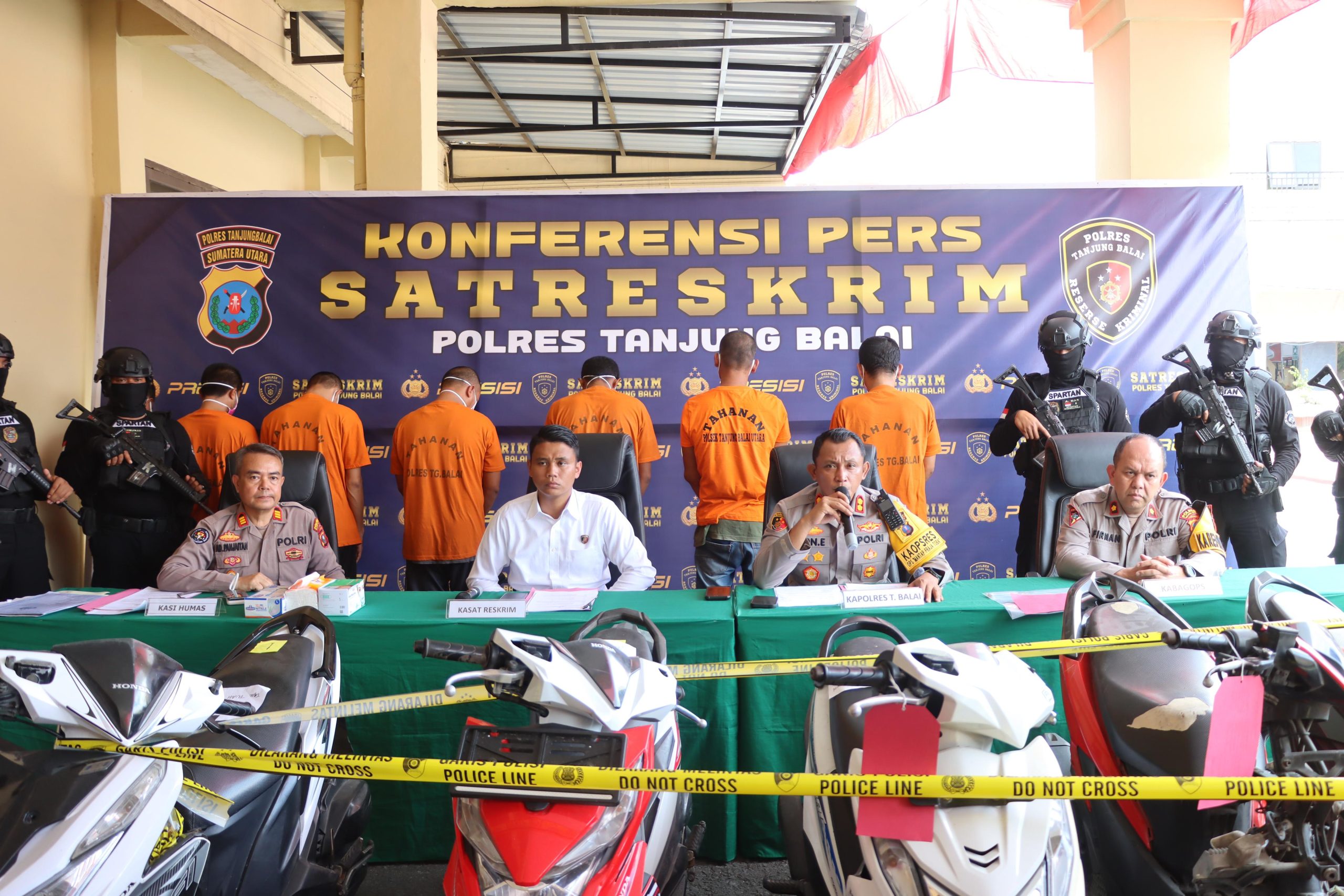 “Dari hasil pengungkapan kasus tindak pidana pencurian dengan pemberatan dan penadahan barang hasil kejahatan ini, kami telah mengamankan sebanyak 9 orang tersangka pelaku yakni ASN alias Tuah, MA alias Ari, JL alias Asom, S alias Supri, MR alias Riski, MA alias Ary, Il alias Ilham, Khaidir Ahmad alias Amat dan Syafrizal Sinaga alias Ijal. Bersama keseluruhan tersangka yang diamankan itu, juga turut diamankan barang bukti sebanyak 15 unit sepeda motor yang diduga hasil kejahatan namun belum ada Laporan Polisi diantaranya adalah Suzuki Smash warna hitam tanpa plat, Suzuki Smash warna silver tanpa plat, Yamaha Jupiter warna hitam tanpa plat, Honda Supra Fit tanpa plat, Honda Beat warna merah jambu tanpa plat, Honda CBR150R warna hitam dengan plat BK 4112 VBN, Kawasaki Ninja warna hijau dengan plat BK 5835 VAL, Honda Verza warna hitam dengan plat BK 2215 YBD, Honda PCX warna merah dengan plat BK 2902 VBW, Honda Vario warna merah tanpa plat, Honda Supra 15 tanpa plat, Honda Beat warna merah putih tanpa plat, Yamaha Jupiter MX warna biru tanpa plat, Honda CBR warna hitam tanpa plat dan Honda Vario warna hitam tanpa plat,” ujar Kapolres Tanjungbalai ini.