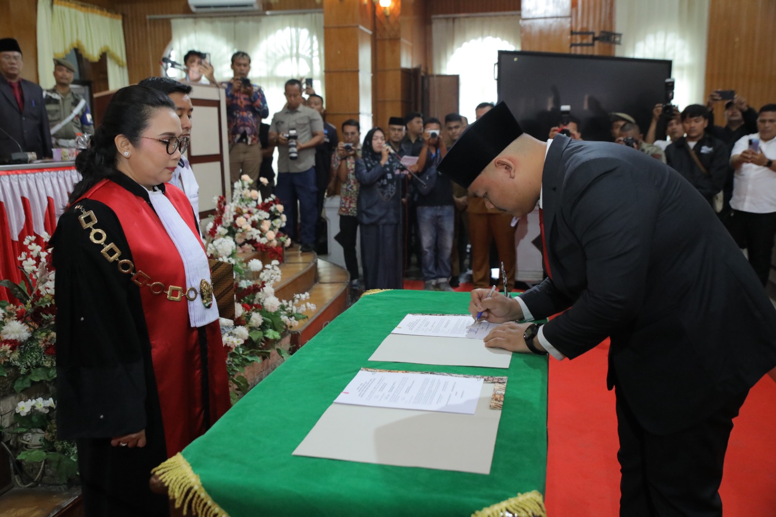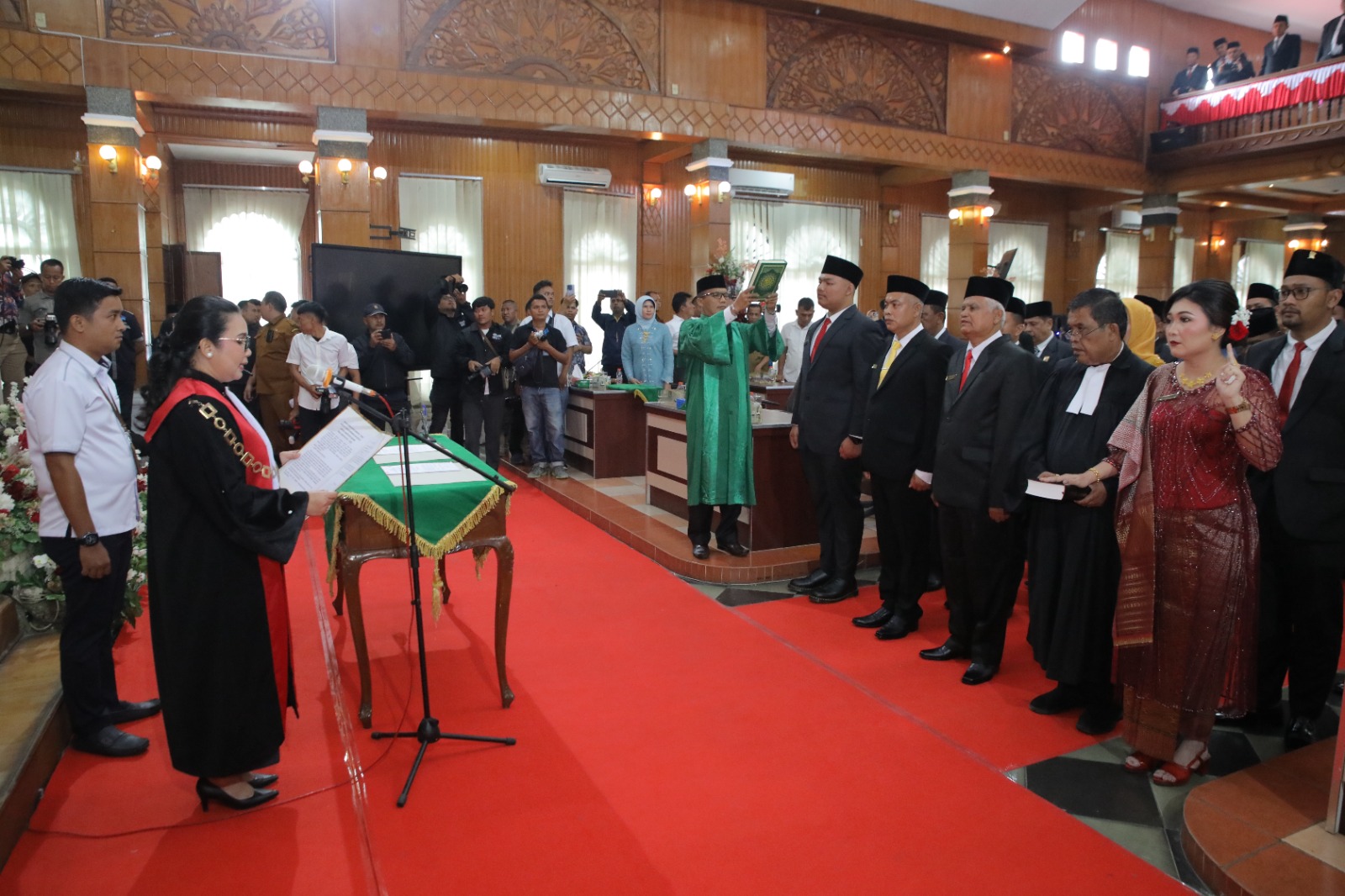 Terlihat pengambilan sumpah/janji 45 anggota DPRD Kabupaten Asahan periode 2024- 2029 dipandu oleh Ibu Ketua Pengadilan Negeri Kisaran Halida Rahardhini, S.H., M.Hum dan selanjutnya dilaksanakan penandatanganan berita acara serta penyematan lencana DPRD.