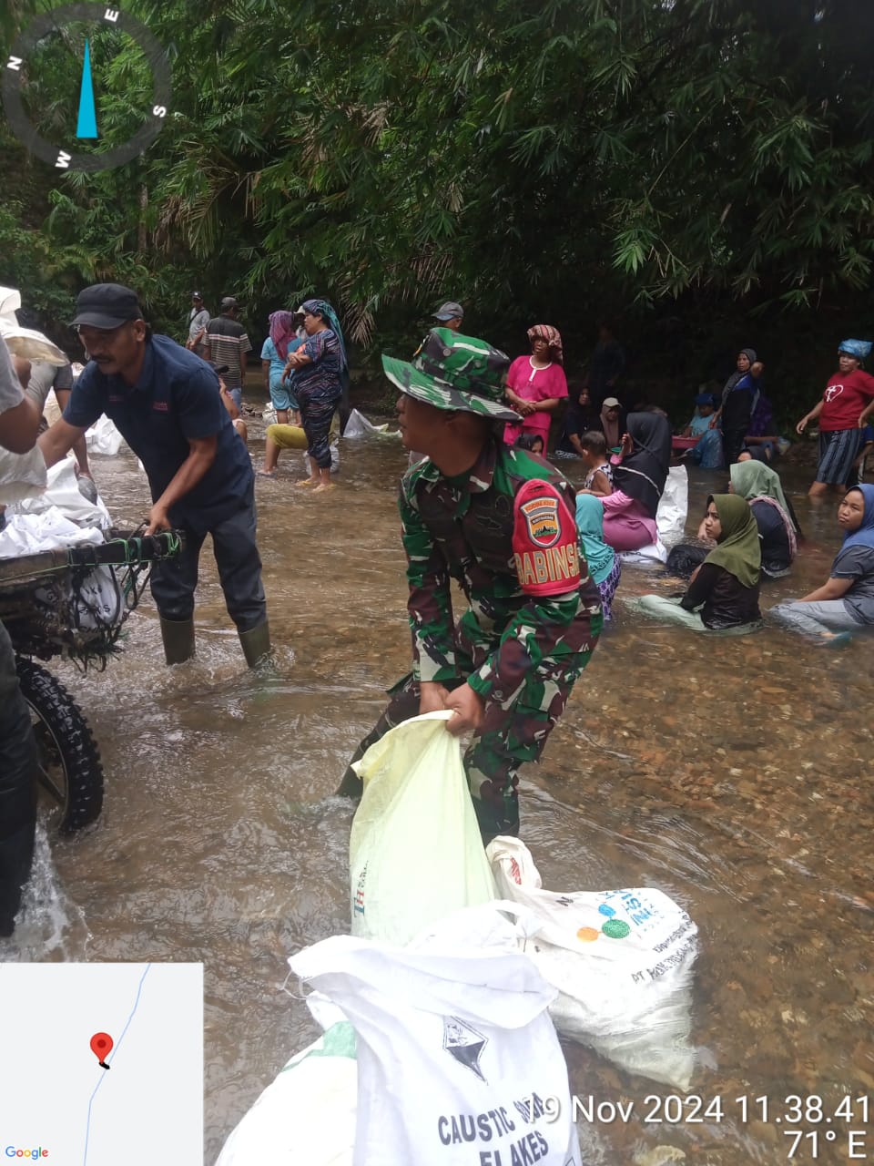 TASLABNEWS | ASAHAN-Kodim 0208 Kabupaten Asahan melalui Koramil- 15/Bandar Pulau Asahan bersama Babinsa Serda Doli indra Lubis bersama Kepala Desa Gunung Berkat, perangkat desa serta warga setempat menggelar kegiatan gotong royong pengambilan material batu sirtu secara manual dari Aek Tapusi, Dusun V, Desa Gunung Berkat, Kecamatan Bandar Pulau, Kabupaten Asahan, Selasa (19/11/2024).