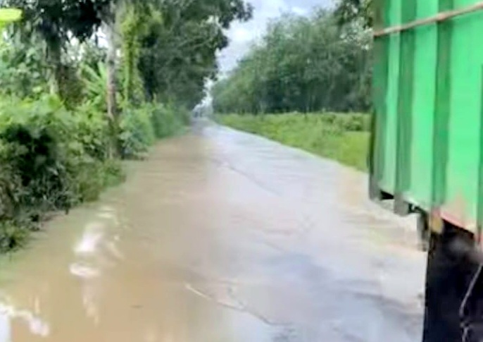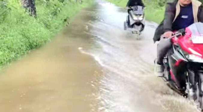 Selain itu tampak jalan seluruh tertutup genangan air sehingga para pengendara harus memperlambat kendaraannya ketika melalui jalan tersebut.