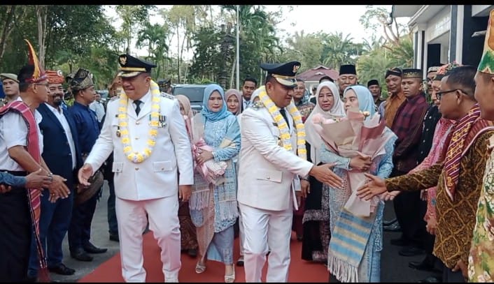 Kedatangan bupati dan wakil bupati di sambut dengan prosesi adat Melayu, di iringi dengan lantunan marhaban.