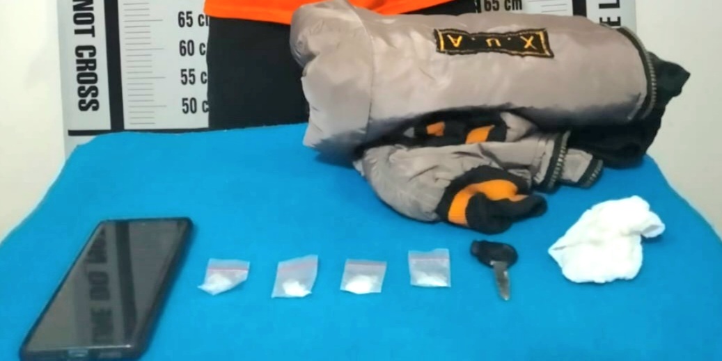 Kemudian ditemukan barang berupa 3 paket sabu dari kantong jaket warna coklat sebelah kirinya dan 1 paket sabu dibalut tissu dari kantong celana depan sebelah kiri serta 1 unit Handphone merek Tecno Spark warna Hitam.