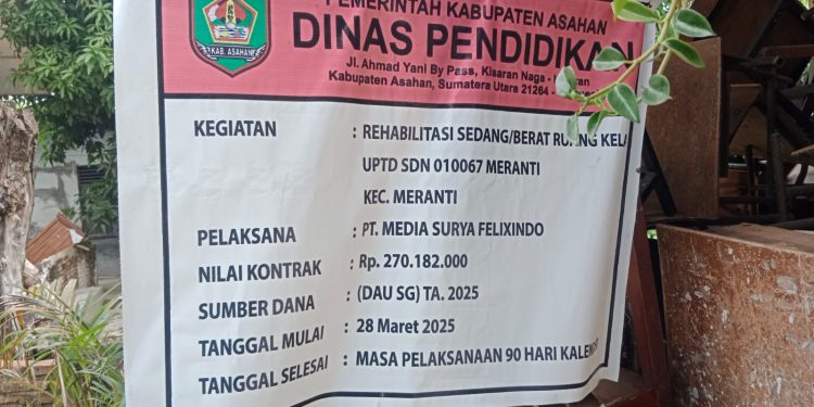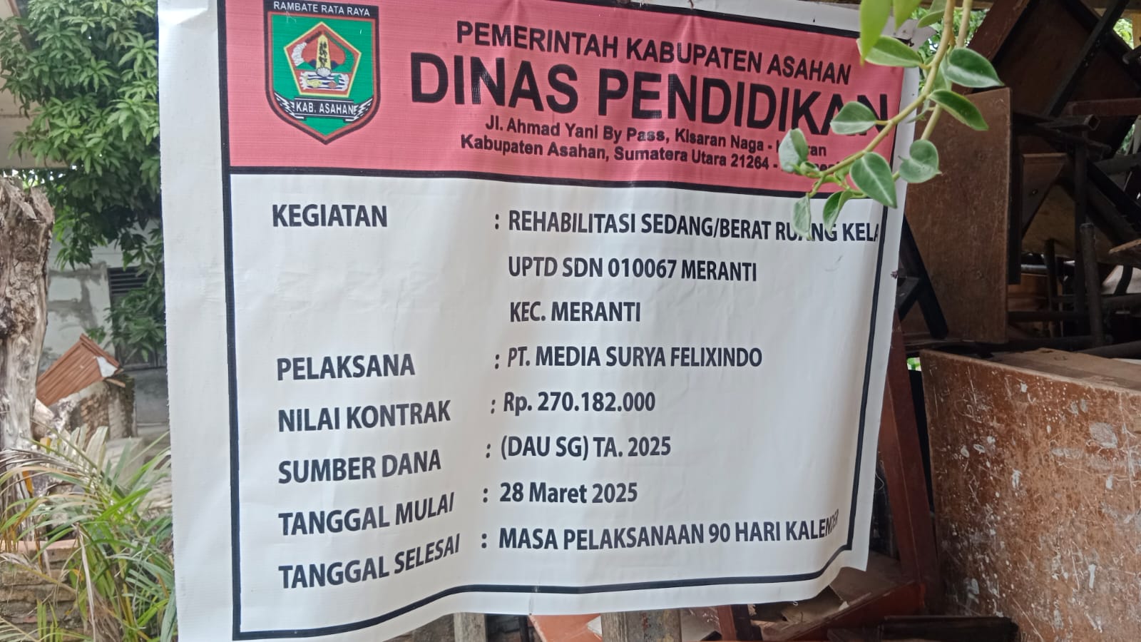 Di ketahui pekerjaan rehap ruang kelas di kerjakan oleh PT. Media Surya Felikindo dengan anggaran sebesar Rp270.182.000 bersumber dari (DAU SG) tahun 2025 dengan masa kerja 90 hari terhitung dari 28 Maret 2025. (Edi/Syaf)