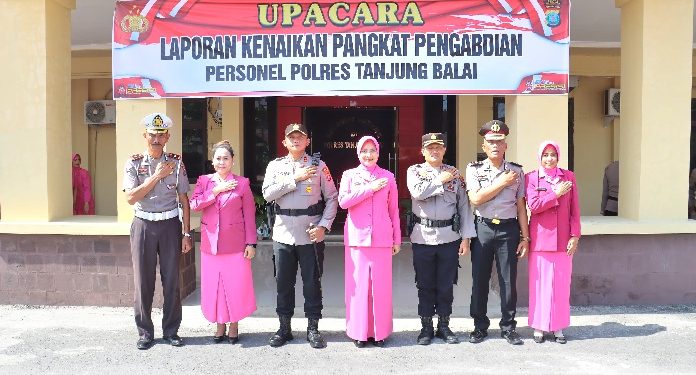 Kedua orang PJU yang mendapatkan kenaikan pangkat pengabdian itu dilantik dalam upacara yang digelar di Lapangan Apel Mapolres Tanjungbalai pada hari Minggu (1/6/25).