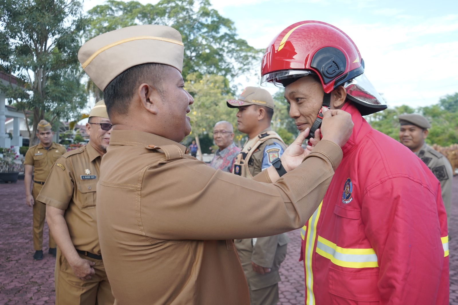 Lebih lanjut, Wakil Bupati juga menyerahkan perlengkapan baru kepada petugas Pemadam Kebakaran (Damkar). Baliau menyampaikan harapan agar kinerja Damkar semakin meningkat dan profesional dalam melayani masyarakat.