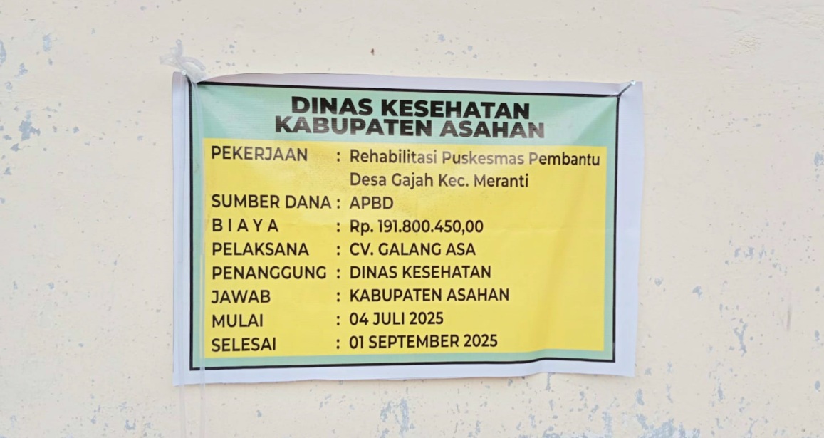 Dari papan plang tertulis sumber dana dari APBD Kabupaten Asahan tahun 2025, yang dikerjakan oleh CV Galang Asa dengan penanggung jawab Dinas Kesehatan Kabupaten Asahan.