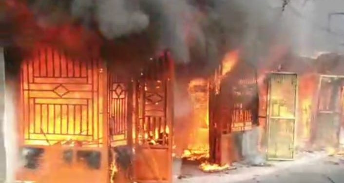 Dalam hitungan menit, kobaran api membesar dan menyambar ke bangunan lain di sekitarnya. Ledakan kecil dari dalam toko semakin mempersulit warga untuk melakukan pemadaman mandiri.