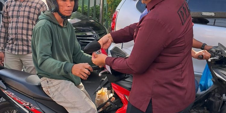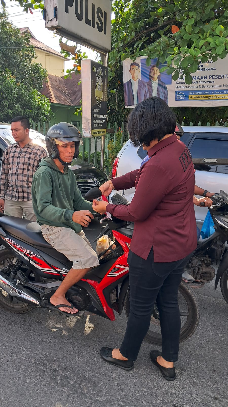 Menyambut HUT ke 80 Kemerdekaan RI, Kasat Reskrim Polres Tebing Tinggi AKP Budi Sihombing, SH melaksanakan kegiatan pembagian dan pemasangan Bendera Merah-Putih kepada masyarakat pengguna jalan yang melintas di depan Mako Polres Tebing Tinggi, Jalan Pahlawan, Kamis (14/8/2025).