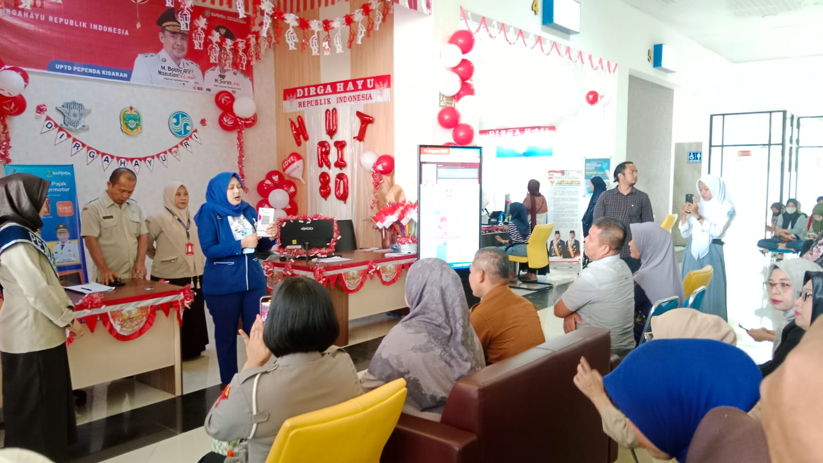 Di sela-sela pelayanan kepada masyarakat wajib pajak, Kepala Dinas Penanaman Modal, Pelayanan Terpadu Satu Pintu (DPMPTS) Kabupaten Asahan Syahputra, Dalam Rangka menyambut HUT RI ke 80 tahun 2025 melaksanakan kegiatan bersama Dinas dan Instansi Vertikal yang memiliki gerai di Mal Pelayanan Publik untuk menghias gerai dengan Nuansi Merah Putih dengan Thema Kemerdekaan sehingga menimbulkan kecintaan kita kepada NKRI dalam.mengisi kemerdekaan