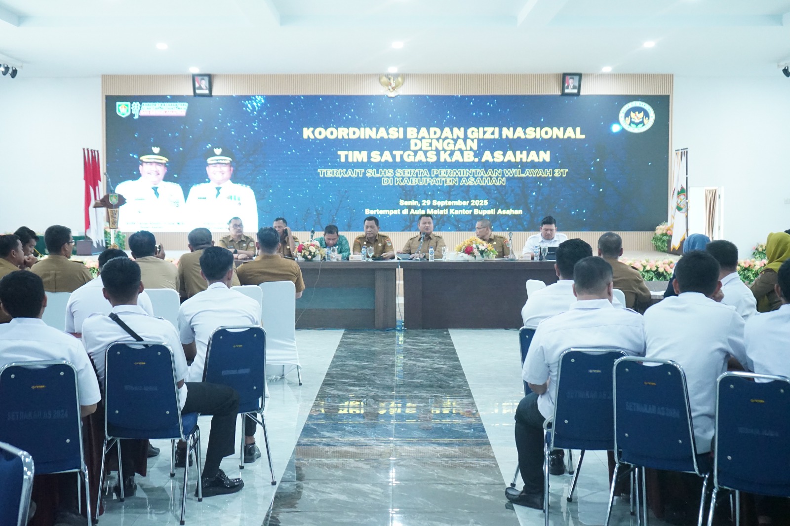 TASLABNEWS – Pemerintah Kabupaten Asahan bersama Badan Gizi Nasional (BGN) Perwakilan Kabupaten Asahan dan Tim Satgas Kabupaten menggelar rapat koordinasi percepatan Program Makan Gizi Gratis (MBG) di Aula Melati Kantor Bupati Asahan.