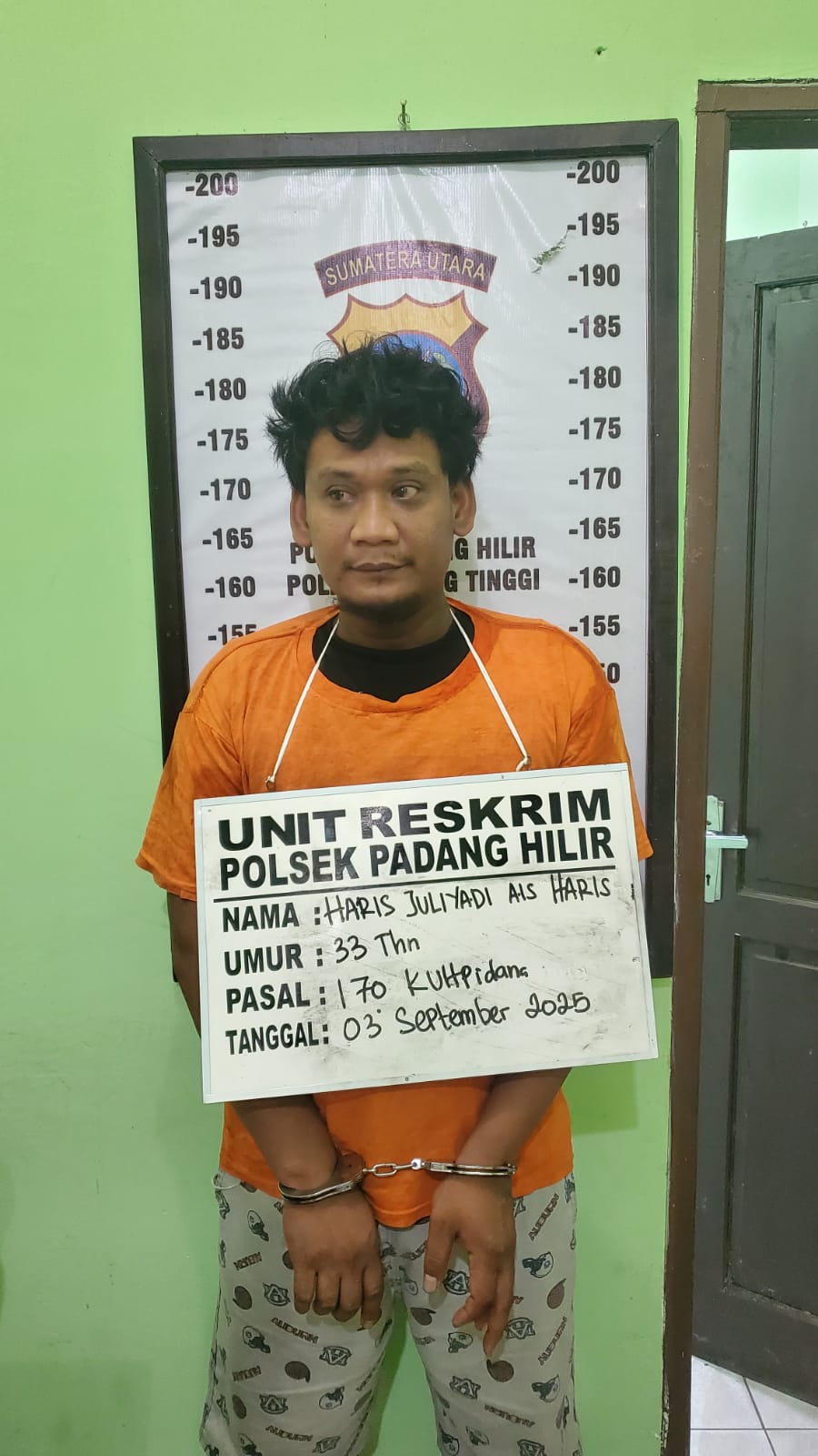 “Pada Rabu siang (3/9), Unit Reskrim Polsek Padang Hilir berhasil menangkap seorang pelaku bernama Haris saat berada dipinggir Jalan Soekarno Hatta tanpa perlawanan. Dari tangan pelaku, polisi menyita dua potong baju berwarna hitam dan satu batang kayu mangga sebagai barang bukti”, ungkap Kapolsek Padang Hilir, AKP Herli D Damanik SH, Kamis (4/9).
