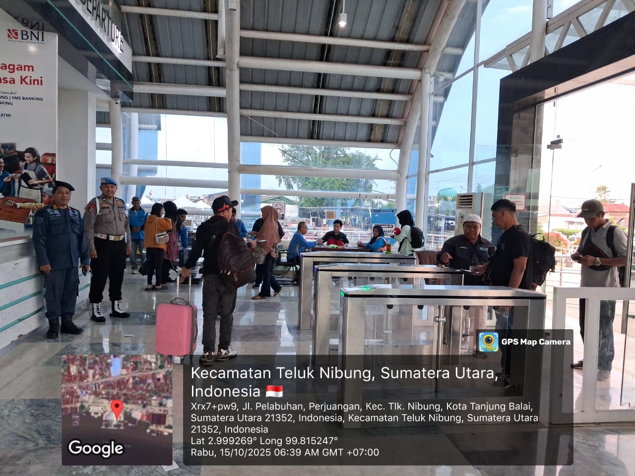 Seperti yang terlihat, Rabu (15/10/25), sejak pukul 06.00 WIB personil Polsek Teluk Nibung Polres Tanjungbalai melakukan pengamanan dan pengawasan terhadap para penumpang kapal Ferry Indomal Regal kedatangan dari Port Dickson Malaysia di terminal penumpang Pelabuhan Teluk Nibung, Kota Tanjungbalai.