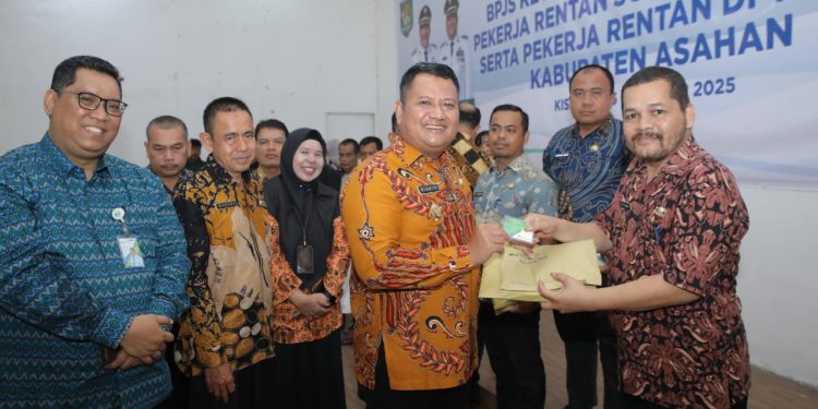 TASLABNEWS — Pemerintah Kabupaten Asahan bersama BPJS Ketenagakerjaan Cabang Asahan menyerahkan secara simbolis 4.900 kartu BPJS Ketenagakerjaan kepada pekerja rentan sosial keagamaan dan pekerja informal lainnya, Kamis (16/10/2025).