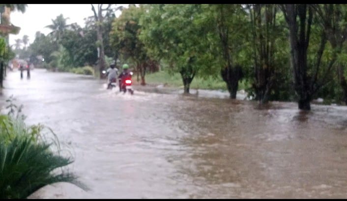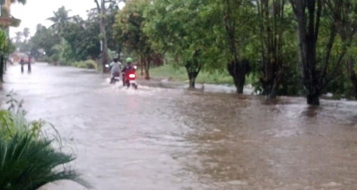 TASLABNEWS, ASAHAN-Diguyur hujan deras sejak malam hari, membuat jalan dan pekarangan rumah warga di Desa Sei Beluru, Kecamatan Meranti, Kabupaten Asahan, Sumatera Utara tergenang air.