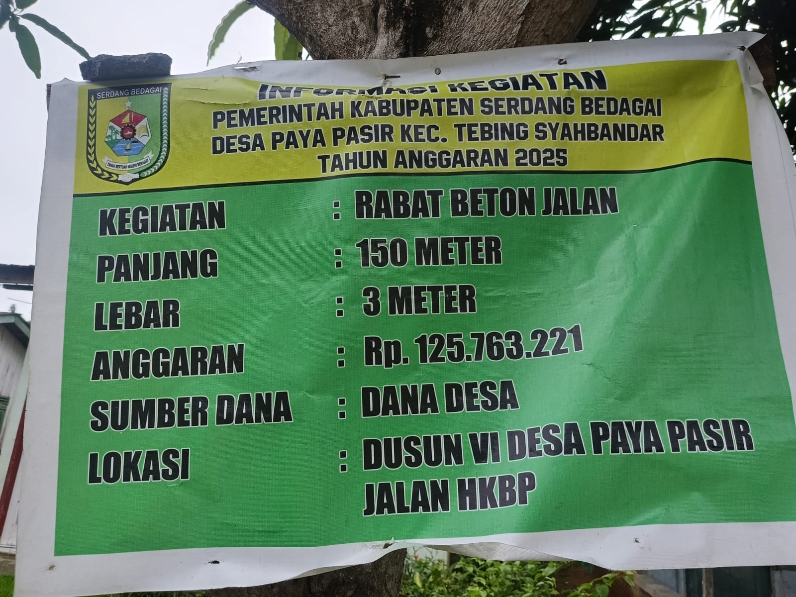 Lanjut Ridwan, seperti kegiatan pada tahun 2025 ini, terdapat pembangunan jalan paving blok di dusun II Gg Sepakat ukuran 3m x 240m senilai Rp 190.459.000, pembangunan jalan dengan rabat beton di dusun VI Jalan HKBP ukuran 3m x 150m senilai Rp 125.763.221 dan penyuluhan dan pelatihan pendidikan masyarakat senilai Rp 51.298.420.