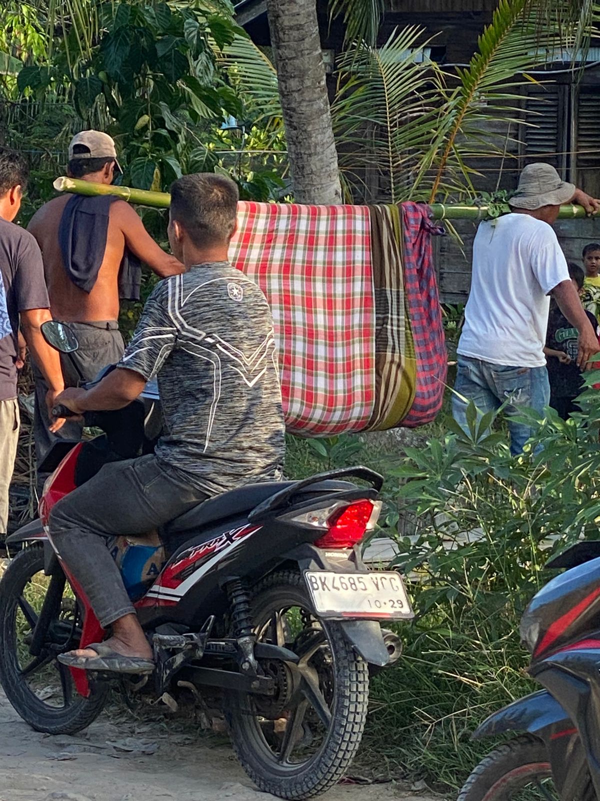 Namun saat akan memasuki kampungnya, karena kondisi jalan tidak memungkinkan untuk dilalui oleh kenderaan roda dua akhirnya Sri ditandu menggunakan kain.