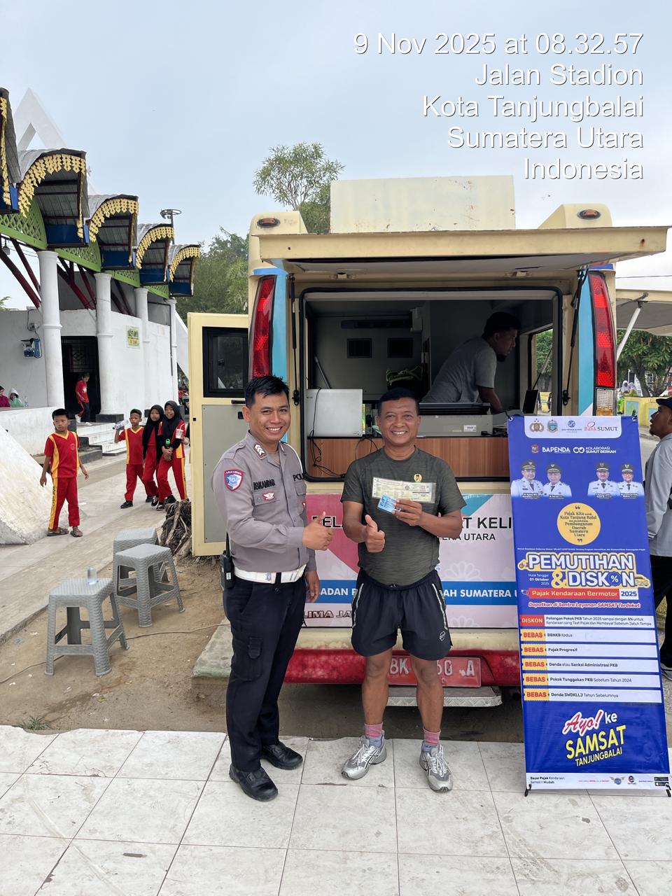 TASLABNEWS, TANJUNGBALAI – Samsat Keliling Polres Tanjungbalai turut hadir mengisi kegiatan Car Free Day (CFD) yang dilaksanakan di Lapangan Sultan Abdul Jalil Rahmadsyah, Kota Tanjungbalai yang dilaksanakan, Minggu (9/11).