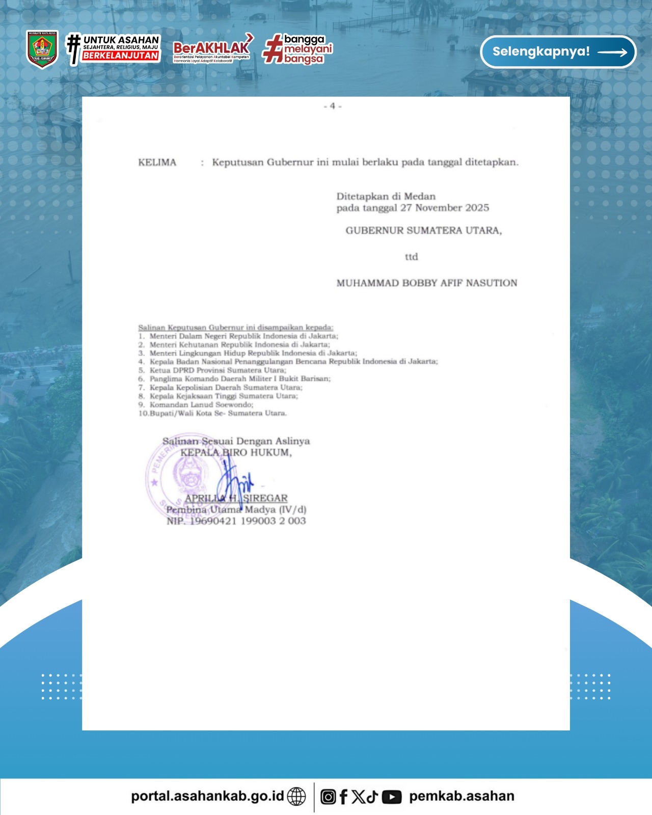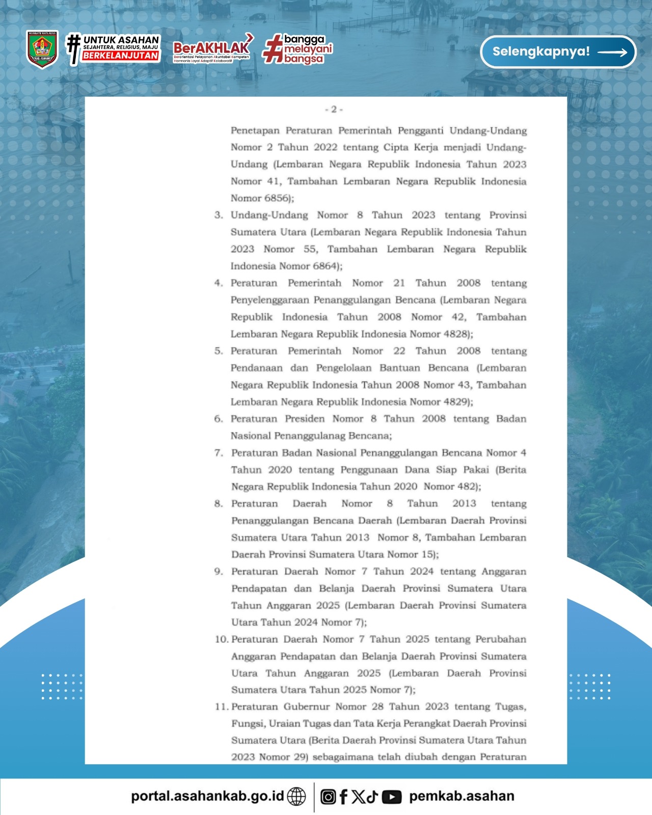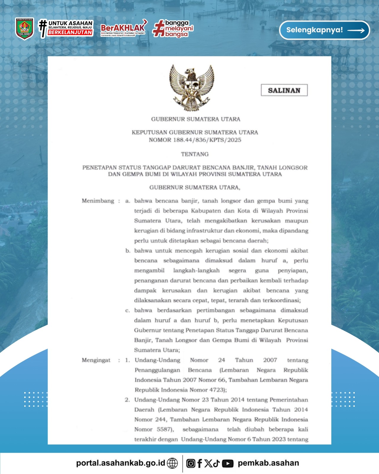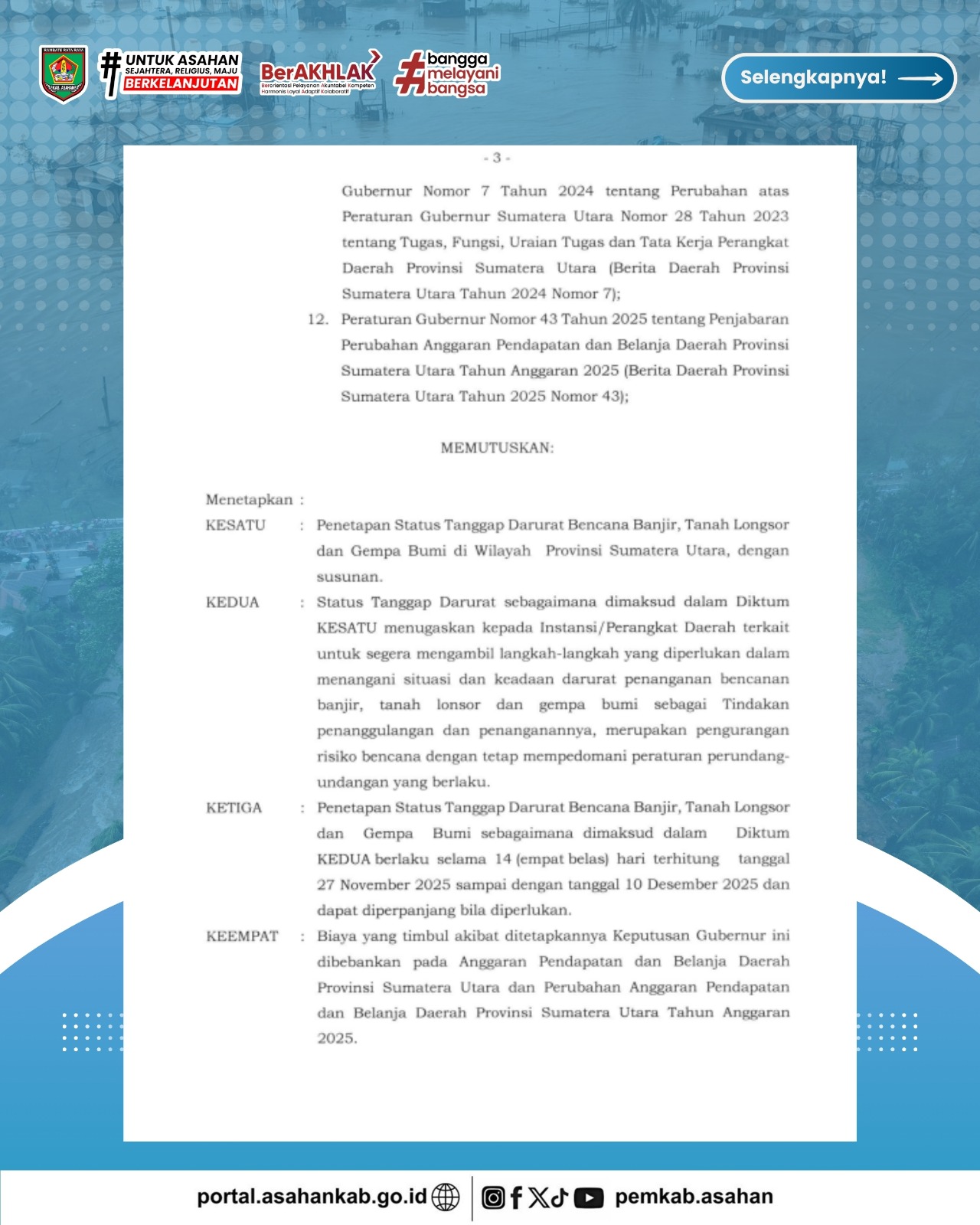 Pemerintah Kabupaten Asahan mengimbau masyarakat untuk tetap waspada, memantau informasi resmi pemerintah, dan segera melapor melalui kanal penanganan bencana apabila menemukan situasi darurat di lingkungan masing-masing.