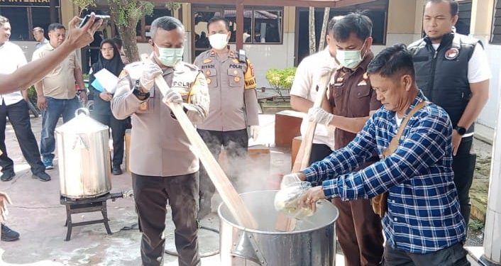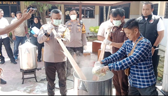 Pemusnahan barang bukti tersebut dilakukan dengan cara direbus, dan dihadapkan ke 3 tersangka secara langsung.Selasa (23/12/2025)