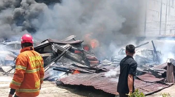 Kebakaran hebat melanda gudang penyimpanan mobil di Jalan Sisingamangaraja, Kelurahan Tegal Sari, Kecamatan Kisaran Barat, Kabupaten Asahan, Sumatera Utara Kamis (2/4/2026) sekitar pukul 12.45 WIB dan membuat warga panik.