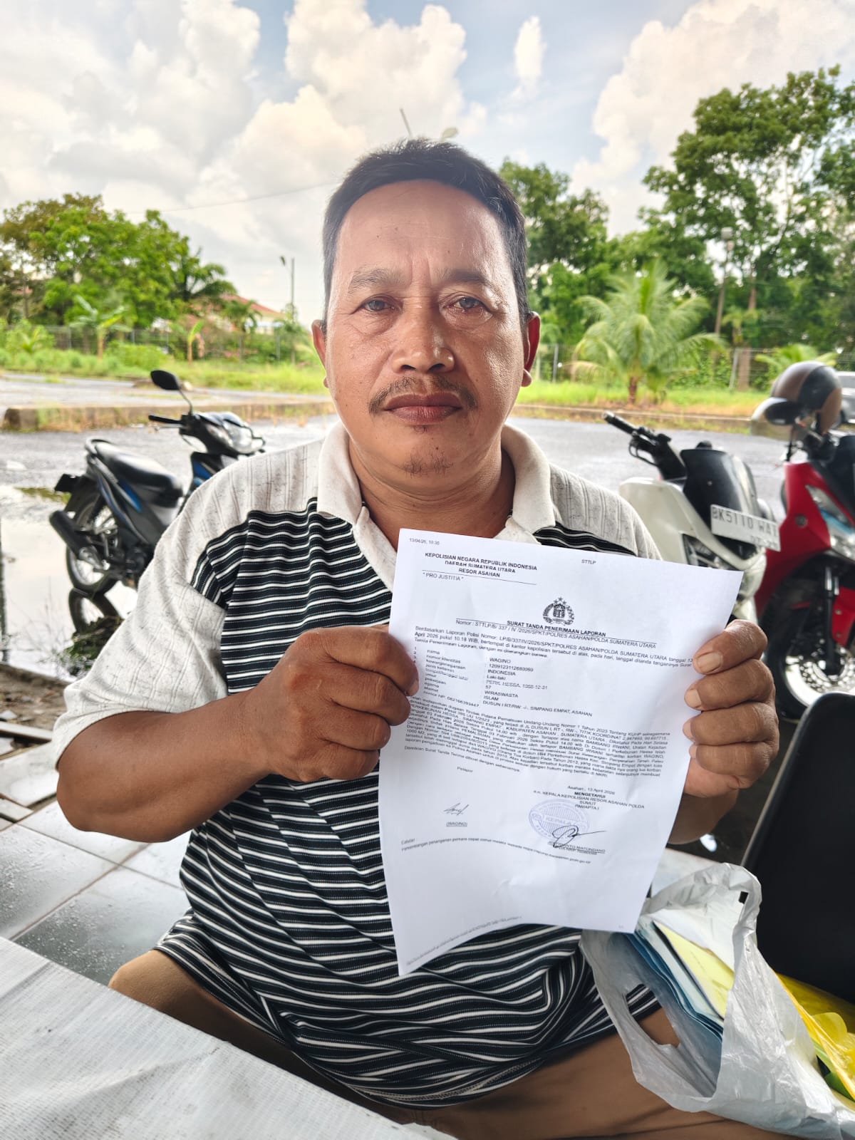 Wagino (58) warga Dusun I, Desa Perkebunan Hessa , Kecamatan Simpang Empat melaporkan kasus tersebut dengan bukti STTLP / B/ 337 / IV / 2026 / SPKT / POLRES ASAHAN / POLDA SUMATERA UTARA.